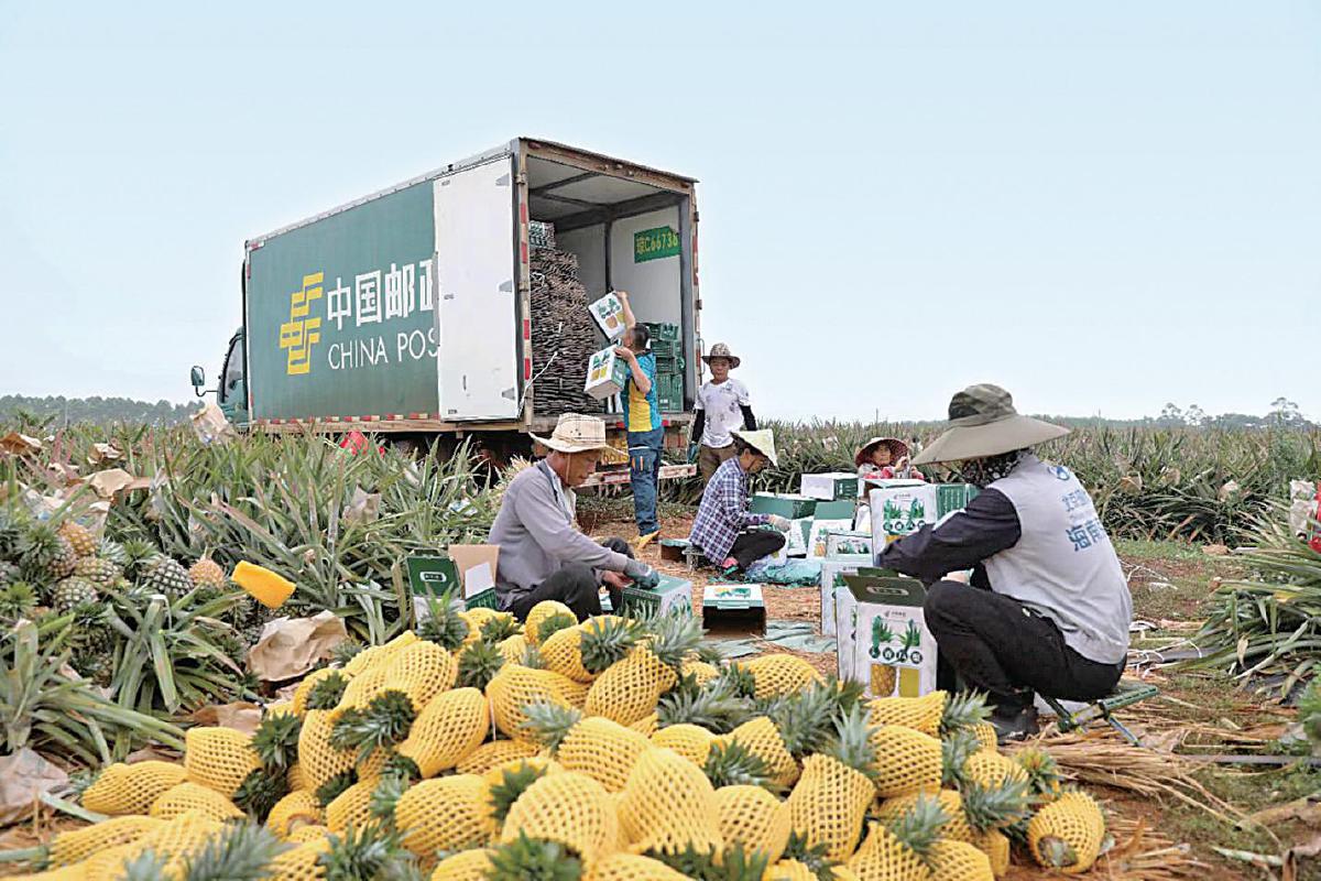郵政工作人員在美香村種植基地現(xiàn)場(chǎng)收寄鳳梨?! 趺戏彩ⅰz