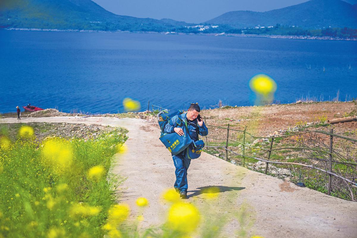 綠色摩托車、綠色郵包、絳紅色渡船、碧波蕩漾的水面和遠(yuǎn)處如黛的群山,石新國(guó)穿行其間,如同置身一幅青山綠水的秀美畫卷?!斑@條郵路我已經(jīng)走了20多年,只要鄉(xiāng)親們需要,我會(huì)一直走下去?!笔聡?guó)堅(jiān)定地說(shuō)。