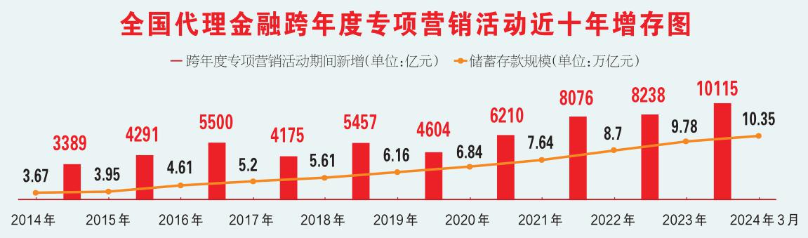 目前,全國郵政代理金融(2023—2024)跨年度專項(xiàng)營銷活動已圓滿結(jié)束,各級機(jī)構(gòu)內(nèi)外兼修強(qiáng)服務(wù)、客戶至上增價值、拓客增存增收,取得了顯著成效?;顒悠陂g,儲蓄存款新增10115億元,其中,價值存款新增10254億元,價值存款新增占比為101.4%;代發(fā)單位新增25448戶,代發(fā)金額達(dá)4072億元。截至2024年3月末,全國郵政代理金融儲蓄存款規(guī)模達(dá)103529億元??缒甓葘m?xiàng)營銷活動成為全國郵政代理金融儲蓄存款高位爬坡的“主引擎”,近10次跨年度專項(xiàng)營銷活動累計新增儲蓄存款59234億元,今年2月,儲蓄存款規(guī)模邁上10萬億元?dú)v史性新臺階。