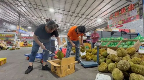 采訪完徐鈺鋒,記者跟隨潘新杰來到離郵政倉不遠(yuǎn)的水果市場,為當(dāng)日線上訂單客戶挑選榴蓮?!傲裆徱ㄟ^敲打來分辨生熟程度。偏生,就適合發(fā)較遠(yuǎn)的地區(qū);偏熟,則適合發(fā)往近的地方,這樣可以保證客戶收到水果時(shí)生熟正好。如果天氣熱,還要加冰來保證果肉新鮮。芒果如果是發(fā)到東北,我們會(huì)加裝保溫袋來避免水果凍傷。”說起不同水果的“發(fā)運(yùn)經(jīng)”,潘新杰滔滔不絕。