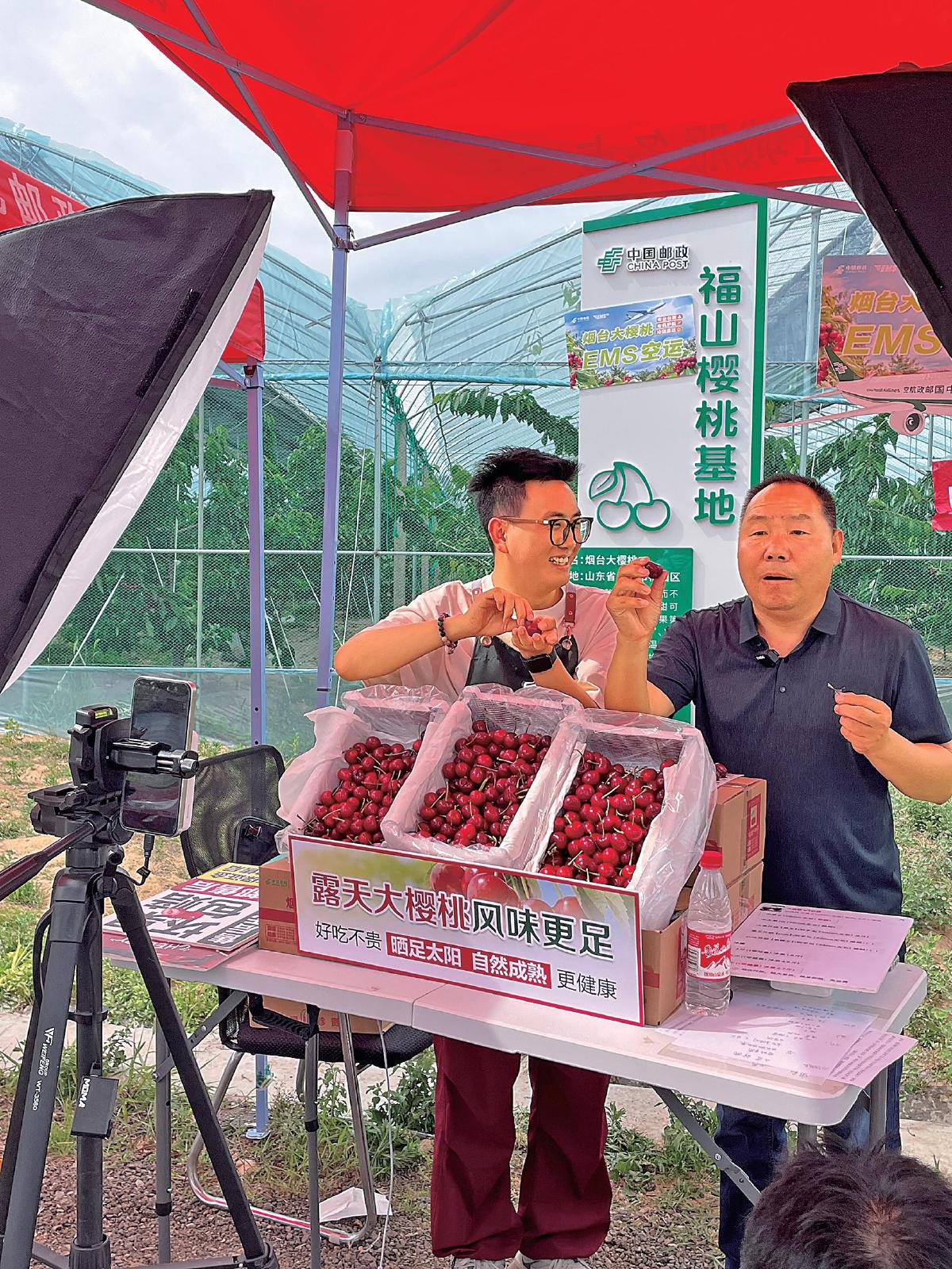 郵政員工與當(dāng)?shù)睾献魃缲?fù)責(zé)人在大櫻桃基地進(jìn)行現(xiàn)場直播?! 趵铞I 攝