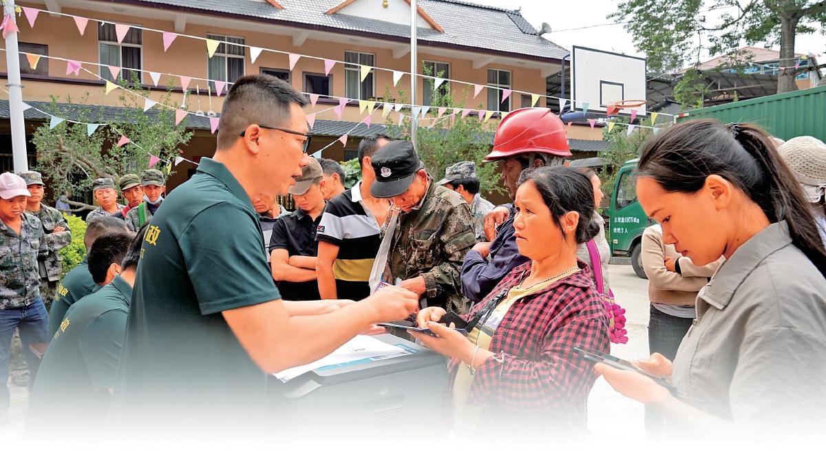 5月16日,在云南省普洱市瀾滄縣阿里村郵政臨時(shí)服務(wù)點(diǎn),郵政員工為村民現(xiàn)場(chǎng)辦理摩托車(chē)滅失注銷(xiāo)登記、保險(xiǎn)繳納等業(yè)務(wù),受到群眾的熱烈歡迎?!踔袊?guó)郵政報(bào)記者 張晉通 攝