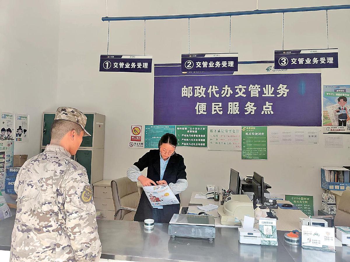 麗江郵政交管業(yè)務(wù)便民服務(wù)點(diǎn)的工作人員為客戶(hù)辦理交管業(yè)務(wù)。