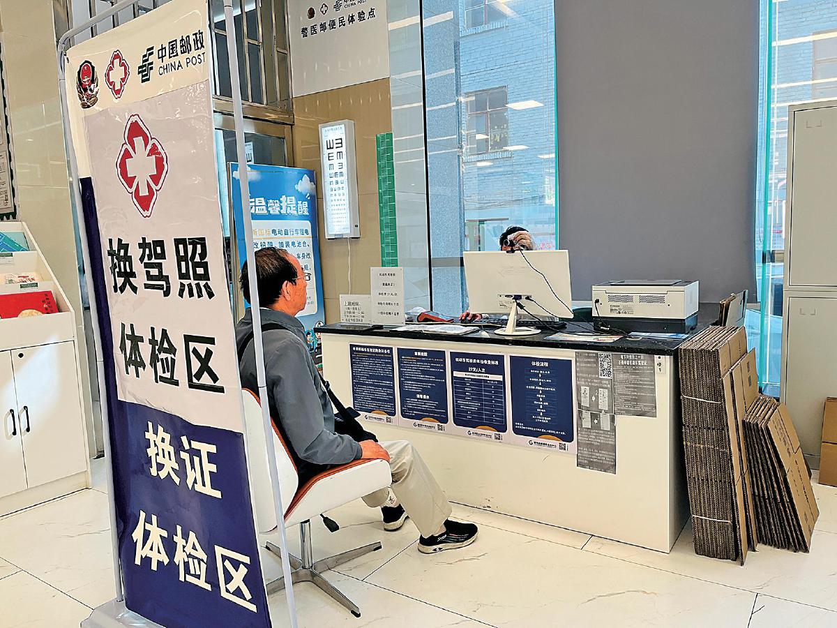 在昆明市吳井路郵政支局,工作人員為辦理機(jī)動(dòng)車(chē)駕駛證換證業(yè)務(wù)的客戶(hù)進(jìn)行體檢。