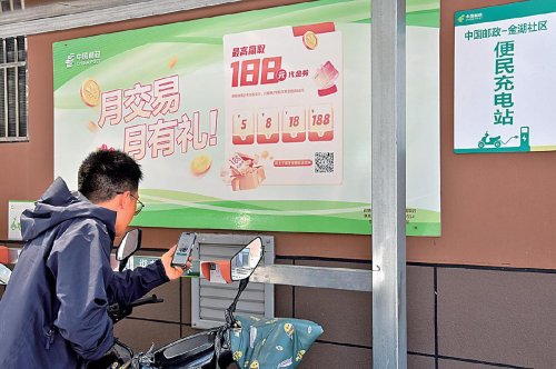 小區(qū)居民在鎮(zhèn)江郵政打造的便民充電站前掃碼充值,使用充電設(shè)備。