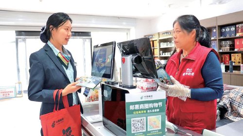 淮安郵政網(wǎng)點(diǎn)人員向煙酒超市收銀員推薦郵惠商圈活動(dòng)。