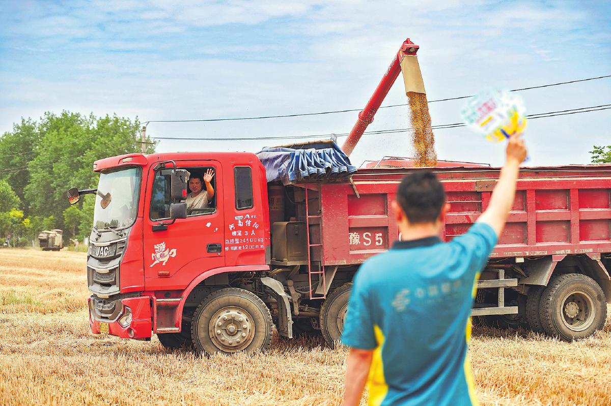 6月,在河南省駐馬店市西平縣老王坡高標(biāo)準(zhǔn)農(nóng)田示范區(qū),大型收割機(jī)一字排開(kāi),在金黃色的麥浪中翩翩起舞、來(lái)往穿梭。與老王坡相距不遠(yuǎn)的盆堯鎮(zhèn)于營(yíng)村郵政合作收糧點(diǎn),一輛輛滿載豐收小麥的卡車(chē)魚(yú)貫而入,金黃色麥粒如同瀑布般從車(chē)斗里傾瀉而下?!案兄x郵政為我辦理了‘糧食收購(gòu)貸’,保證收糧資金充裕?!笔占Z點(diǎn)負(fù)責(zé)人于成功說(shuō)。
