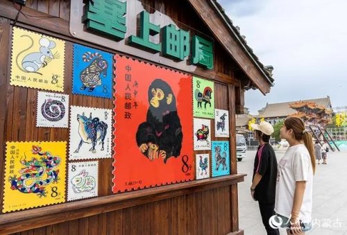 6月18日,游客在呼和浩特市玉泉區(qū)塞上老街旅游休閑街區(qū)“塞上主題郵局”前觀看郵票宣傳品。