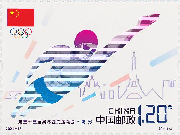第三十三屆奧林匹克運(yùn)動會將于法國巴黎當(dāng)?shù)貢r間2024年7月26日開幕,8月11日閉幕。這是整整一個世紀(jì)后,奧運(yùn)會重回巴黎,法國首都將成為繼倫敦之后第二座三次舉辦夏奧會的城市。該套郵票共2枚,郵票圖案名稱為《游泳》《攀巖》。郵票采用簡約、概括的圖形化設(shè)計方式,展現(xiàn)兩項運(yùn)動的精彩瞬間。郵票第1枚《游泳》(見下圖)表現(xiàn)了男子自由泳的形象,畫面采用從水中仰視的角度,展現(xiàn)運(yùn)動員劈波斬浪、奮力向前的姿態(tài)。郵票第2枚《攀巖》表現(xiàn)了女子速度攀巖的形象,畫面采用斜側(cè)視角,展現(xiàn)運(yùn)動員抬腿踩點、向上攀拉的動作。兩枚郵票的畫面背景為埃菲爾鐵塔等巴黎城市建筑,體現(xiàn)了本屆奧運(yùn)會的地域特色。該套郵票結(jié)合高精度膠版印刷工藝,整體畫面色彩明亮、充滿活力,邊飾漸變過渡自然,同時輔以局部燙印工藝,點亮主題背景,增強(qiáng)畫面動感。