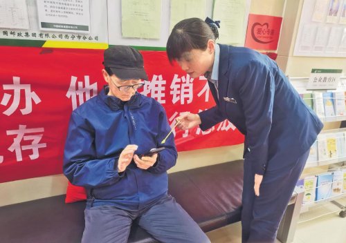 李倩教客戶使用手機(jī)辦理業(yè)務(wù)。