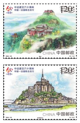 10月18日,《中法建交六十周年》(與法國聯(lián)合發(fā)行)紀念郵票發(fā)行。該套郵票一套2枚,郵票圖案名稱分別為“1.泰山”和“2.圣米歇爾山”。