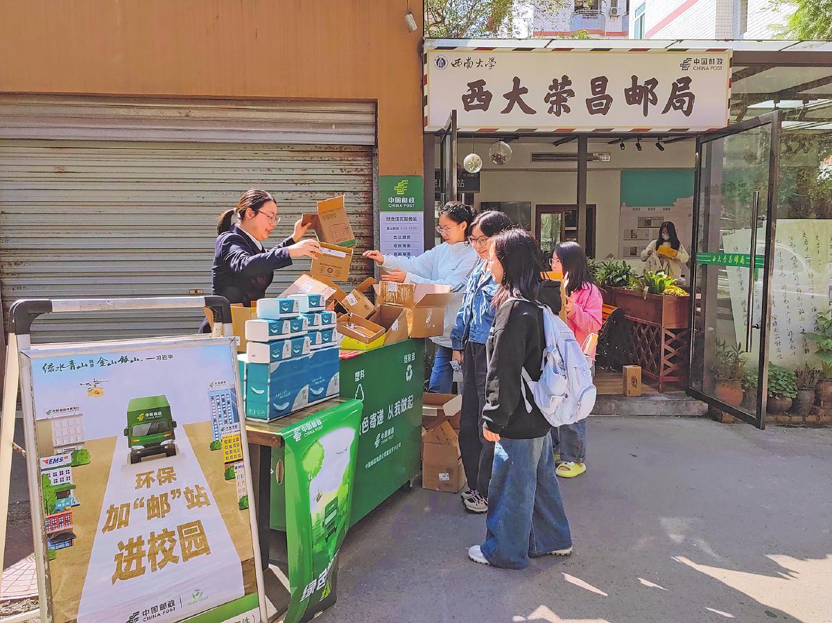 重慶市榮昌區(qū)郵政分公司開展“環(huán)保加‘郵’站進(jìn)校園”活動(dòng),參與者可用舊紙箱換取奶茶一杯。