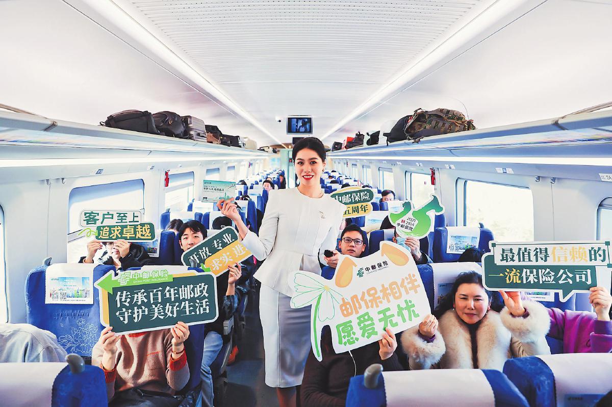 12月20日,中郵保險在江蘇南京南站舉辦了高鐵冠名專列首發(fā)儀式,并在冠名的高鐵品牌列車上開展了“情滿江蘇 服務萬家”金融消保知識問答活動。活動中,中郵保險特邀主持人向乘客介紹了中郵保險的綜合實力與優(yōu)質(zhì)服務,中郵保險工作人員圍繞金融消費者權(quán)益保護,與乘客進行了趣味有獎問答互動,并邀請乘客掃描二維碼,關注中郵保險微信公眾號,觀看《大國保險》普惠促進城鄉(xiāng)融合暨中郵保險專題片。此次活動為乘客們增添了旅途的樂趣,也進一步傳播了中郵保險“郵保相伴 愿愛無憂”的品牌主張。