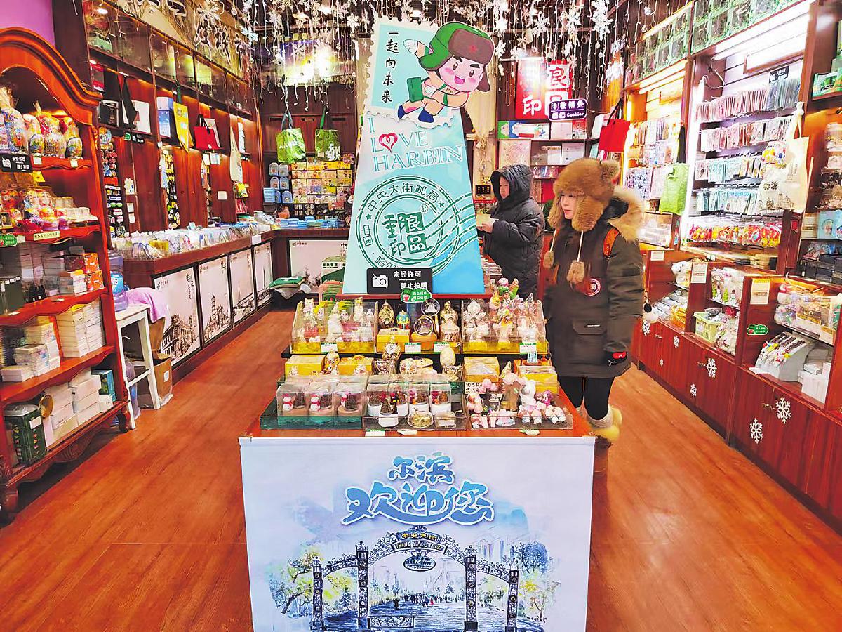 “我們是從漠河一路游玩到哈爾濱的,每到一處都要蓋上幾個紀(jì)念郵戳,買幾樣特色文創(chuàng)產(chǎn)品。中央大街郵局很有特色,紀(jì)念郵戳和明信片設(shè)計得都很漂亮?!币粚π∏閭H開心地展示著自己收集的各地郵戳和明信片。中央大街郵局內(nèi)現(xiàn)有文創(chuàng)產(chǎn)品500多款,僅哈爾濱主題風(fēng)光明信片就有100余種。在中央大街上能看到的糖葫蘆、馬迭爾冰棍、東北大苞米,還有哈爾濱著名的圣·索菲亞大教堂以及其他標(biāo)志性景觀等,都被郵局“搬”到了屋里,成了精致可愛的文創(chuàng)產(chǎn)品。東北話徽章、栩栩如生的郵車模型等更是琳瑯滿目,讓許多游客久久移不開眼。