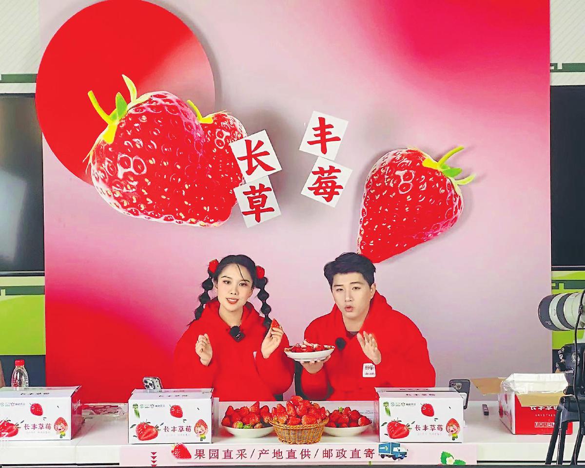合肥郵政直播團(tuán)隊(duì)開展溯源直播,為長豐草莓帶貨。□陳晶 攝
