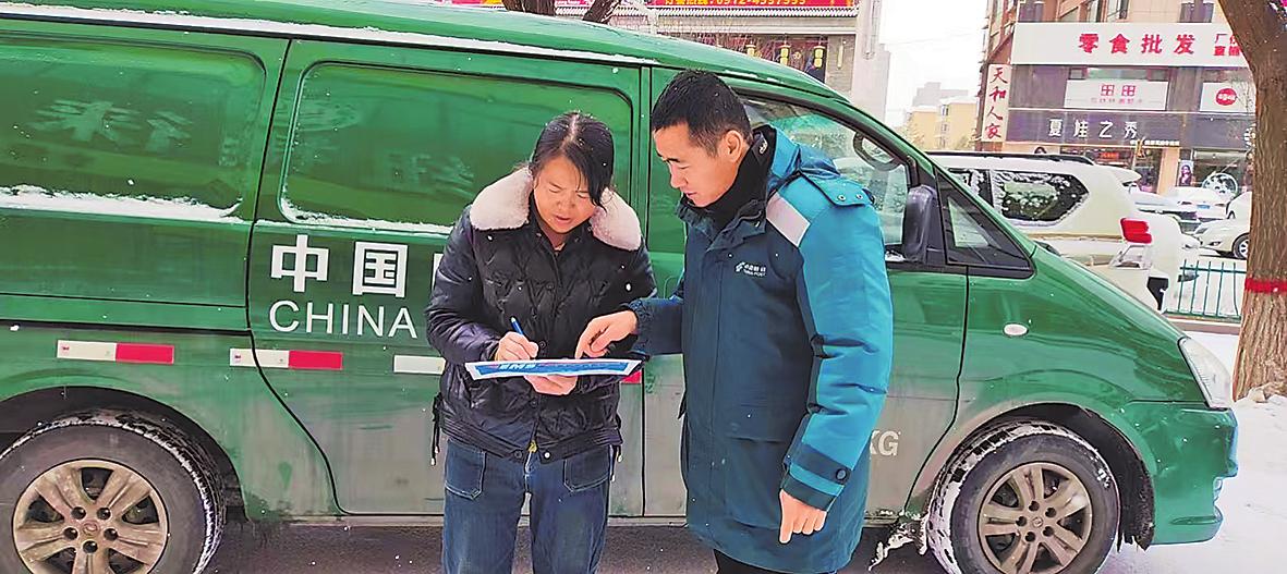 近日,陜西省榆林市定邊縣普降大雪,道路積雪結冰,給人們生活帶來諸多不便。而在各小區(qū)門口、社區(qū)門前都能看到郵政人忙碌的身影,他們一邊耐心地與客戶溝通,一邊迅速地卸下郵件,盡管被凍得手腳麻木,卻依然仔細核對每件郵件信息,確保郵件妥投,贏得了客戶的贊揚?!鯀乔扇亍z影報道