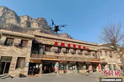 圖為無人機“郵遞員”降落在林州石板巖鎮(zhèn)中心廣場?!埧≤?攝