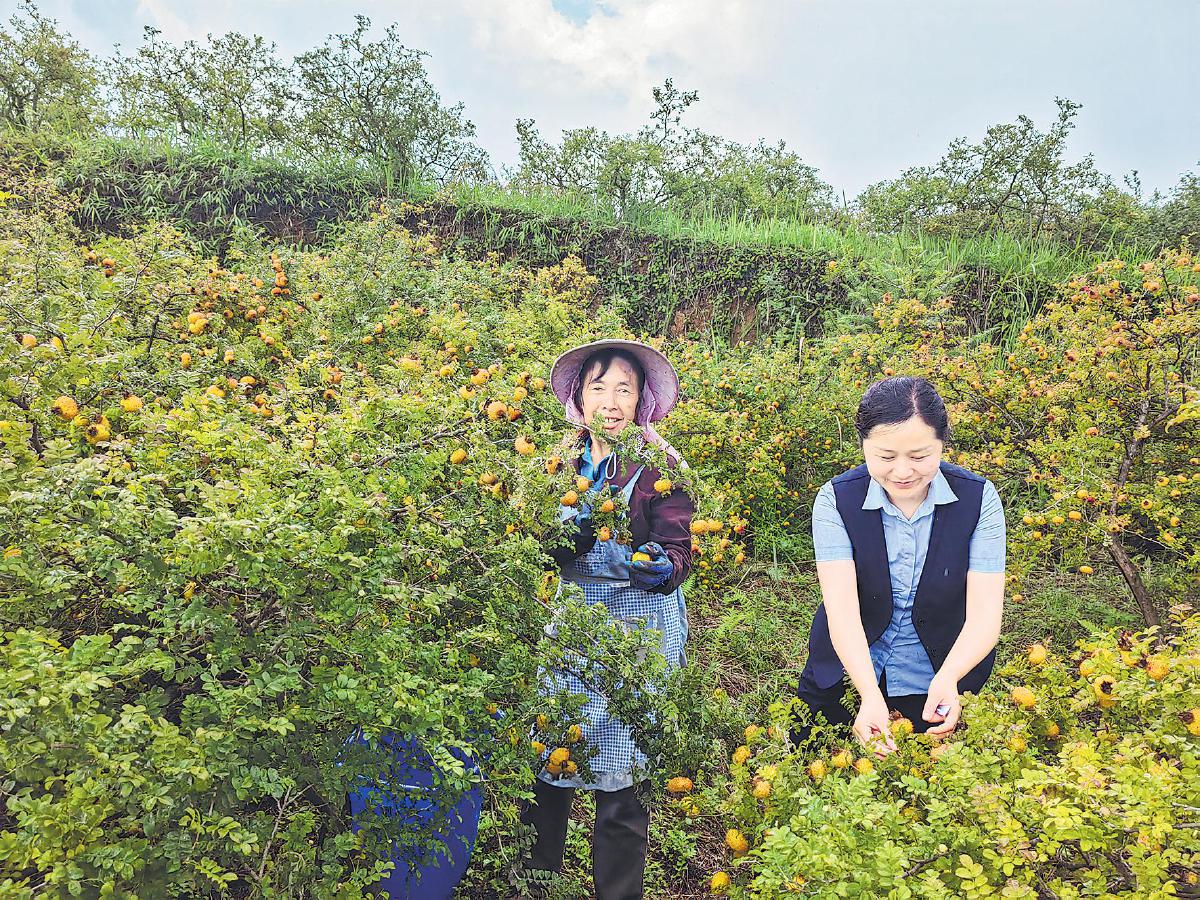 任利華(右)幫農(nóng)戶采摘刺梨。