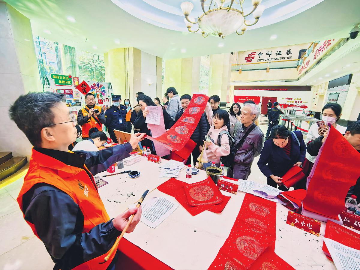 祥龍擺尾送舊歲,靈蛇獻瑞啟新春。臨近春節(jié),廣東省深圳市郵政分公司工會牽頭開展了“蛇來運轉(zhuǎn) 郵行千里 福送萬家”義寫春聯(lián)活動。在寶通大廈、福田濱海營業(yè)所、郵政大廈“職工之家”,特邀的書法家們在一張張喜慶的紅紙上揮毫潑墨,一副副春聯(lián)、一個個“福”字躍然紙上,將飽含著的濃濃喜氣和美好的祝福傳遞給了基層員工和附近的社區(qū)居民。
