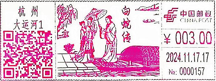 迎接乙巳蛇年,浙江省杭州市郵政分公司特別啟用“白蛇傳”郵資機(jī)宣傳戳一枚,繪制的是許仙為白娘子撐傘的動(dòng)人畫(huà)面。