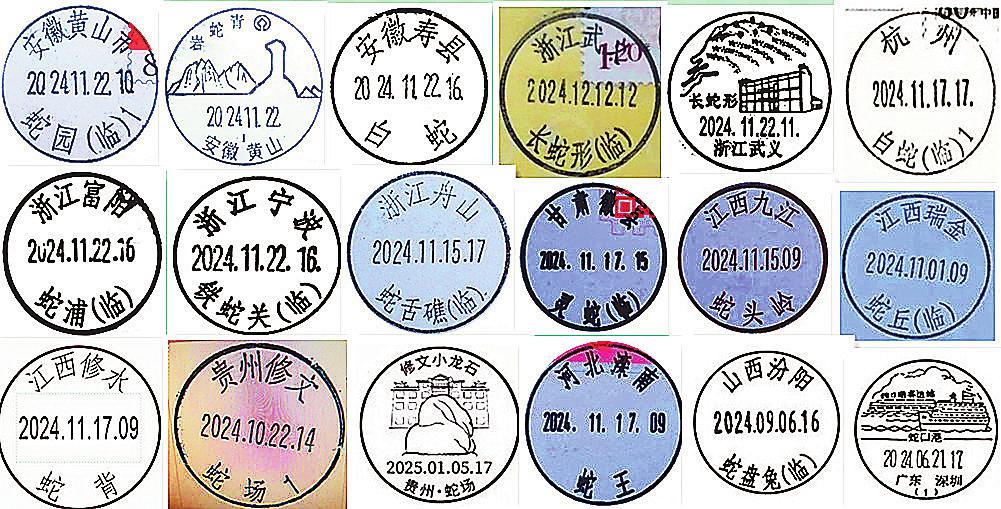 蛇年即將來(lái)臨之際,各地郵政臨時(shí)啟用的部分含“蛇”字臨戳、風(fēng)景戳。