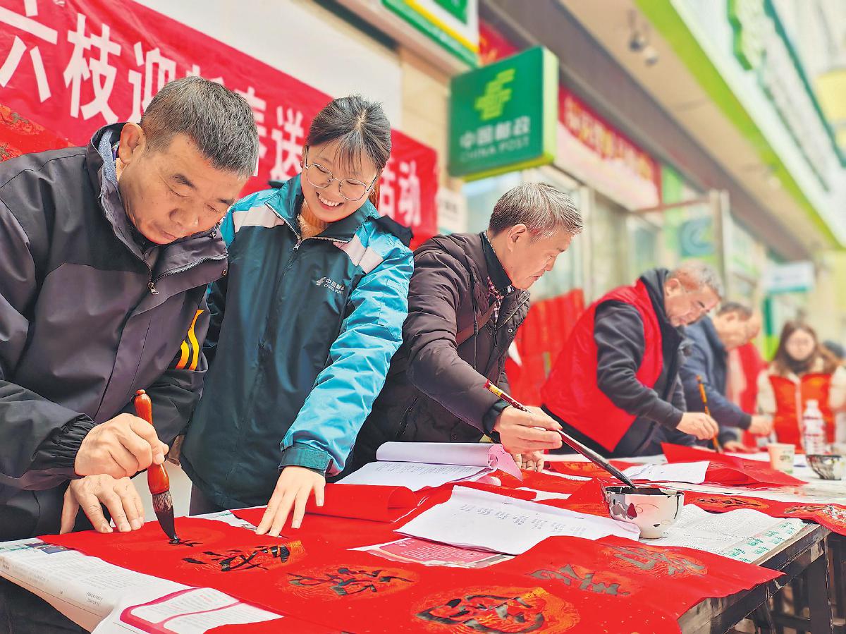 春節(jié)前夕,貴州省六盤水市六枝特區(qū)郵政分公司攜手特區(qū)總工會(huì)和特區(qū)書法家協(xié)會(huì)舉辦“筆走龍蛇祈平安,翰墨飄香迎新春”活動(dòng),免費(fèi)為群眾寫“?!弊帧⑺痛郝?lián)。 □袁玨 攝