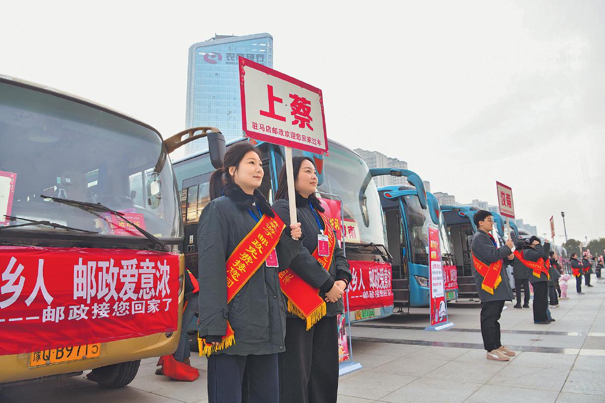 1月21日—27日,河南省駐馬店市郵政分公司開展“情系游子,郵政免費(fèi)接您回家”活動(dòng)。圖為郵政員工在駐馬店西站熱情歡迎返鄉(xiāng)游子。 □賈紅偉 攝