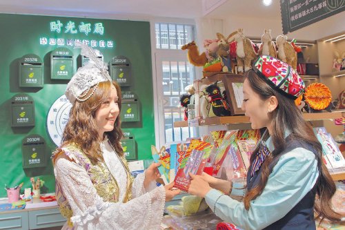 走進(jìn)大巴扎主題郵局,琳瑯滿目的文創(chuàng)產(chǎn)品吸引了眾多游客駐足觀賞、購(gòu)買。整面墻的新疆風(fēng)光明信片和醒目的“時(shí)光郵局”4個(gè)字最先抓住游客的眼球。來自全國(guó)各地的年輕人將對(duì)未來的期待、對(duì)生活的感悟、對(duì)親人的思念,寫在信紙上裝入信封,投入“時(shí)光郵局”的信箱,寄給未來的自己,充滿儀式感。