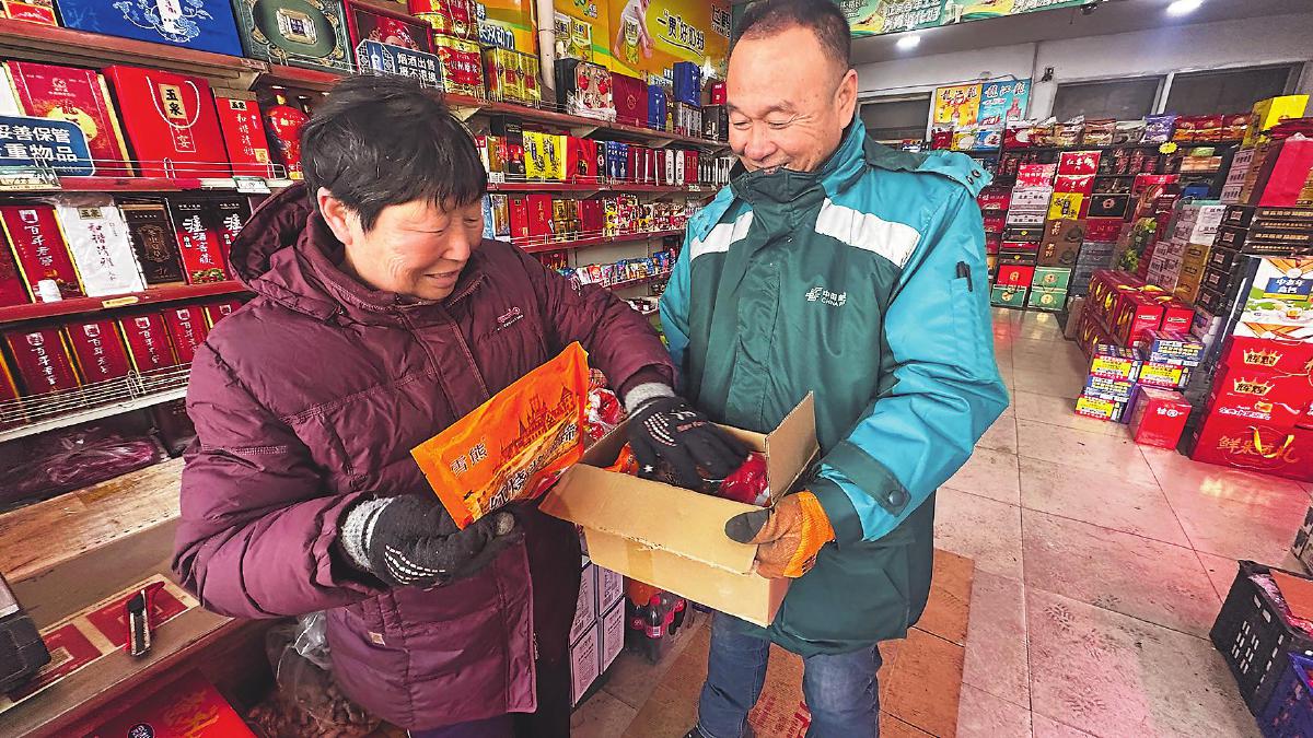 春節(jié)期間,馬鑫來到阿城區(qū)新興村的便民超市上門取件?! 趵涿懒肌z