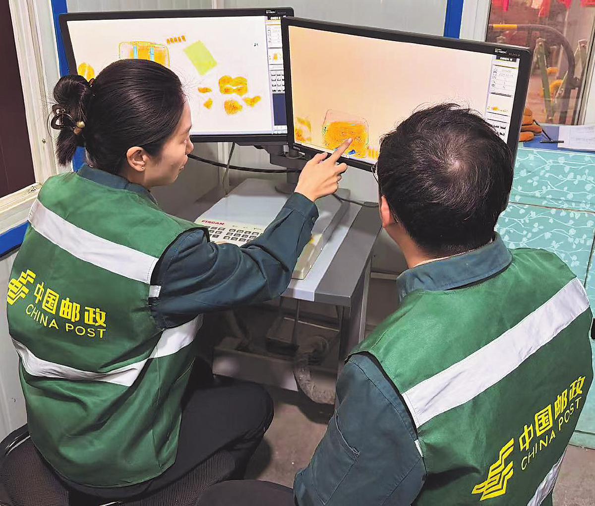 圖為濟(jì)南郵政工作人員對(duì)進(jìn)京郵件進(jìn)行二次過(guò)機(jī)安檢。