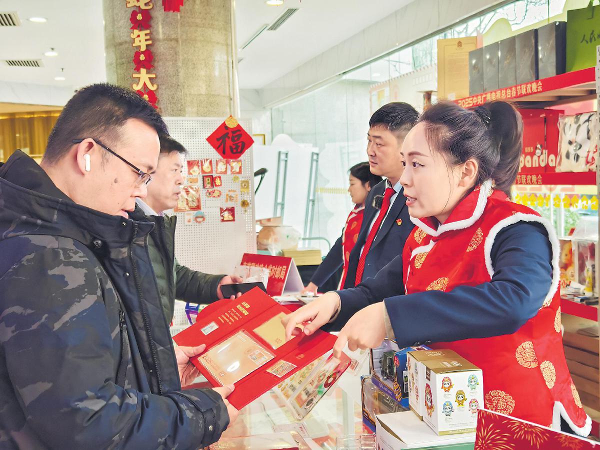 服務(wù)期間,春晚臨時(shí)郵局工作人員向客戶(hù)介紹郵品。