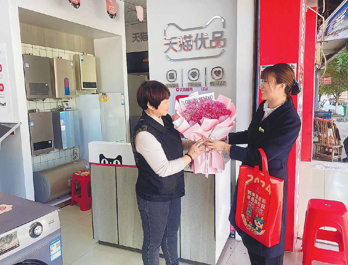 唐學梅(右)在節(jié)日里給大客戶送鮮花。