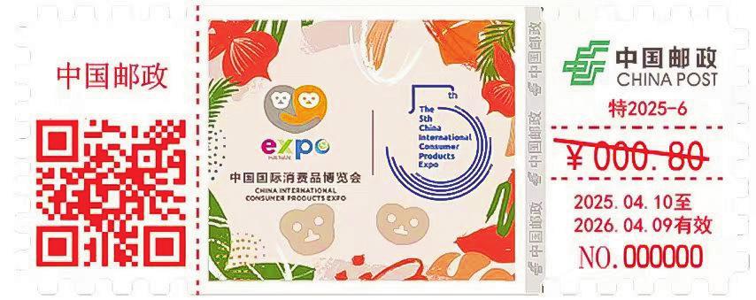“第五屆中國(guó)國(guó)際消費(fèi)品博覽會(huì)數(shù)字化彩色郵資機(jī)宣傳戳”采用目前最新款TS71郵資機(jī)制作,每一枚戳的規(guī)格為72mm×28.5mm,面值為0.8元,使用期限為2025年4月10日至2026年4月9日,全國(guó)共發(fā)行12.1萬(wàn)枚。票面設(shè)計(jì)分為左中右三塊區(qū)域,左側(cè)印有“中國(guó)郵政”字樣;中間區(qū)域?yàn)橹鲌D部分,展現(xiàn)的是消博會(huì)的吉祥物“元元”和“宵宵”擁抱的形象,吉祥物的原型是海南獨(dú)有、世界珍貴的靈長(zhǎng)類動(dòng)物長(zhǎng)臂猿,同時(shí)巧妙地融合了海南熱帶雨林的自然風(fēng)光以及消博會(huì)5周年的標(biāo)識(shí),既展現(xiàn)消博會(huì)的精品路線定位,又蘊(yùn)含了海南特色風(fēng)貌;右側(cè)的上方印有“中國(guó)郵政”字樣及標(biāo)識(shí),下方則是資費(fèi)及使用期限;中間主圖及右側(cè)之間印有郵政特殊金屬防偽線。