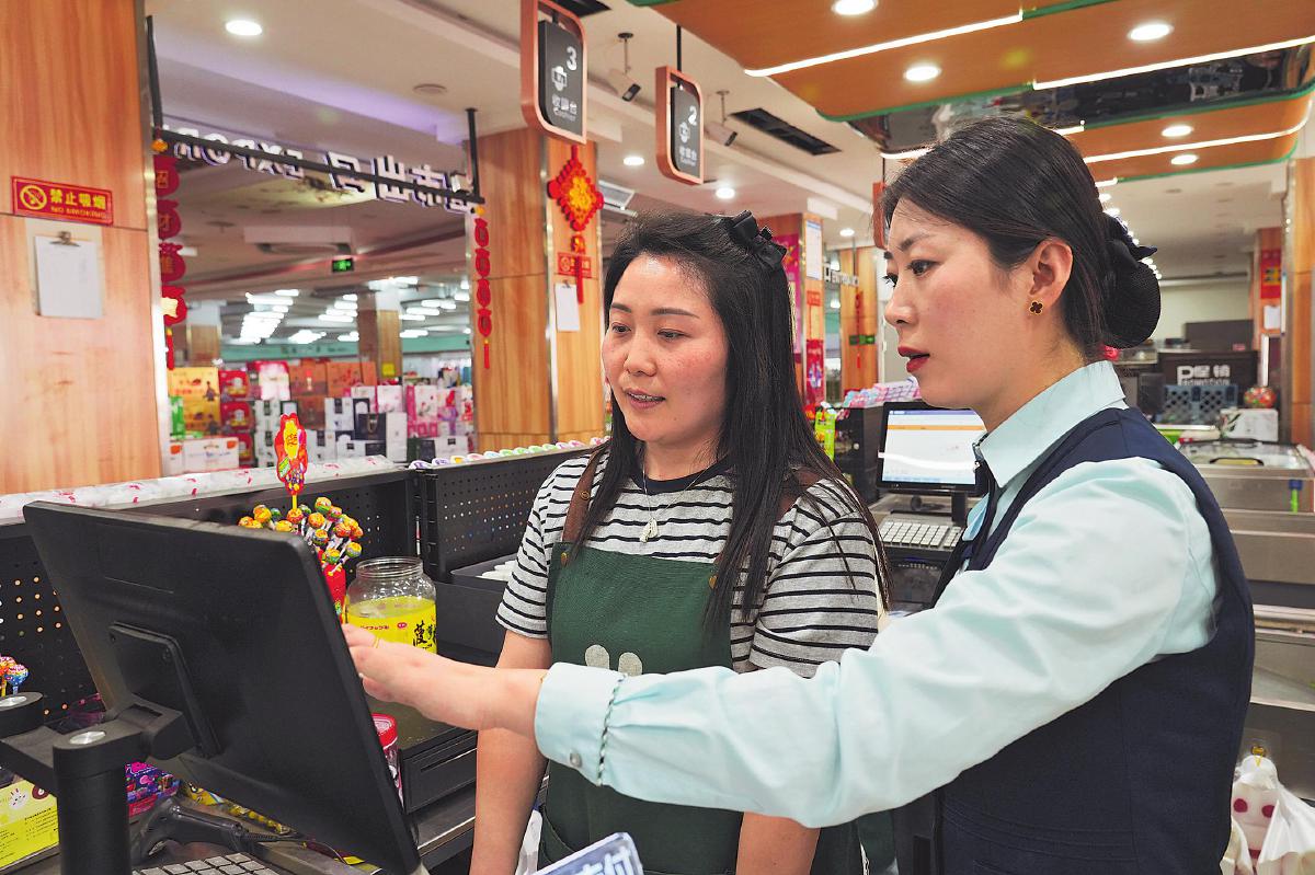 柘城縣迎賓大道支局經(jīng)理劉亞芬為一年四季商貿(mào)有限公司調(diào)試收銀設(shè)備。□王化辰 攝