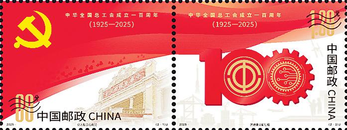 1925年5月1日,中華全國(guó)總工會(huì)在廣州正式成立。百年來(lái),在黨的領(lǐng)導(dǎo)下,中華全國(guó)總工會(huì)櫛風(fēng)沐雨,始終與黨同心、跟黨奮斗,前赴后繼、奮勇拼搏,艱苦奮斗、建功立業(yè),譜寫(xiě)了壯麗的篇章?!吨腥A全國(guó)總工會(huì)成立一百周年》紀(jì)念郵票圖案采用連票設(shè)計(jì)形式,以紅色為主色調(diào)。第一枚“億萬(wàn)職工心向黨”,以黨徽、中華全國(guó)總工會(huì)廣州舊址為畫(huà)面主體,以意象化的紅旗為背景,并點(diǎn)綴心形圖案,象征中華全國(guó)總工會(huì)初心向黨,在黨的領(lǐng)導(dǎo)下走過(guò)百年光輝歷程。第二枚“團(tuán)結(jié)奮斗新征程”,將中華全國(guó)總工會(huì)會(huì)徽、齒輪、芯片等與數(shù)字“100”組合設(shè)計(jì),以意象化的紅旗為背景,并輔以城市建筑、港口、高鐵、飛機(jī)、火箭、空間站及勞動(dòng)者等元素,象征著進(jìn)入新時(shí)代以來(lái),中華全國(guó)總工會(huì)在黨的領(lǐng)導(dǎo)下不斷奮進(jìn),為實(shí)現(xiàn)中華民族偉大復(fù)興作出更大貢獻(xiàn)。