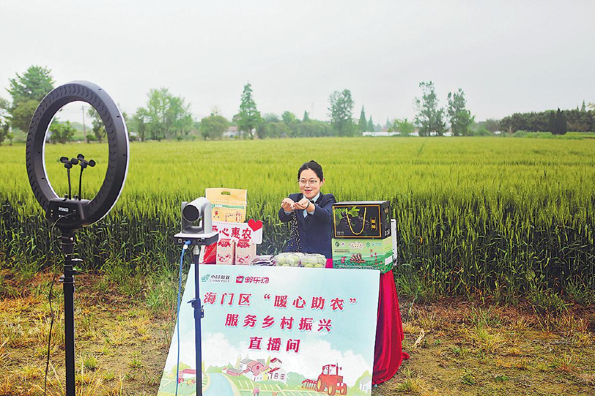 南通市海門區(qū)分公司將“興農(nóng)驛站”直播間設(shè)在田間地頭。(圖片由江蘇省分公司市場(chǎng)部提供)