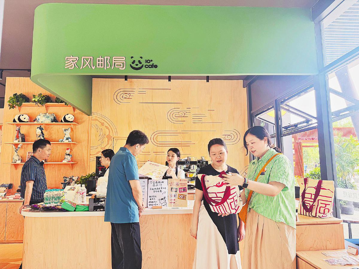 游客在熊貓家風郵局選購集郵文創(chuàng)產(chǎn)品。