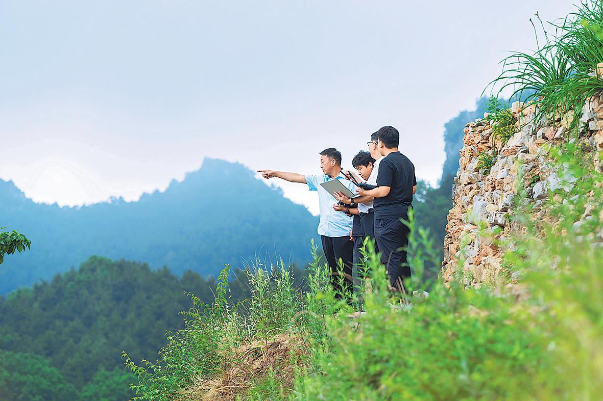 林州郵政工作人員與技術(shù)員在大垴村考察無人機(jī)起降點(diǎn)。