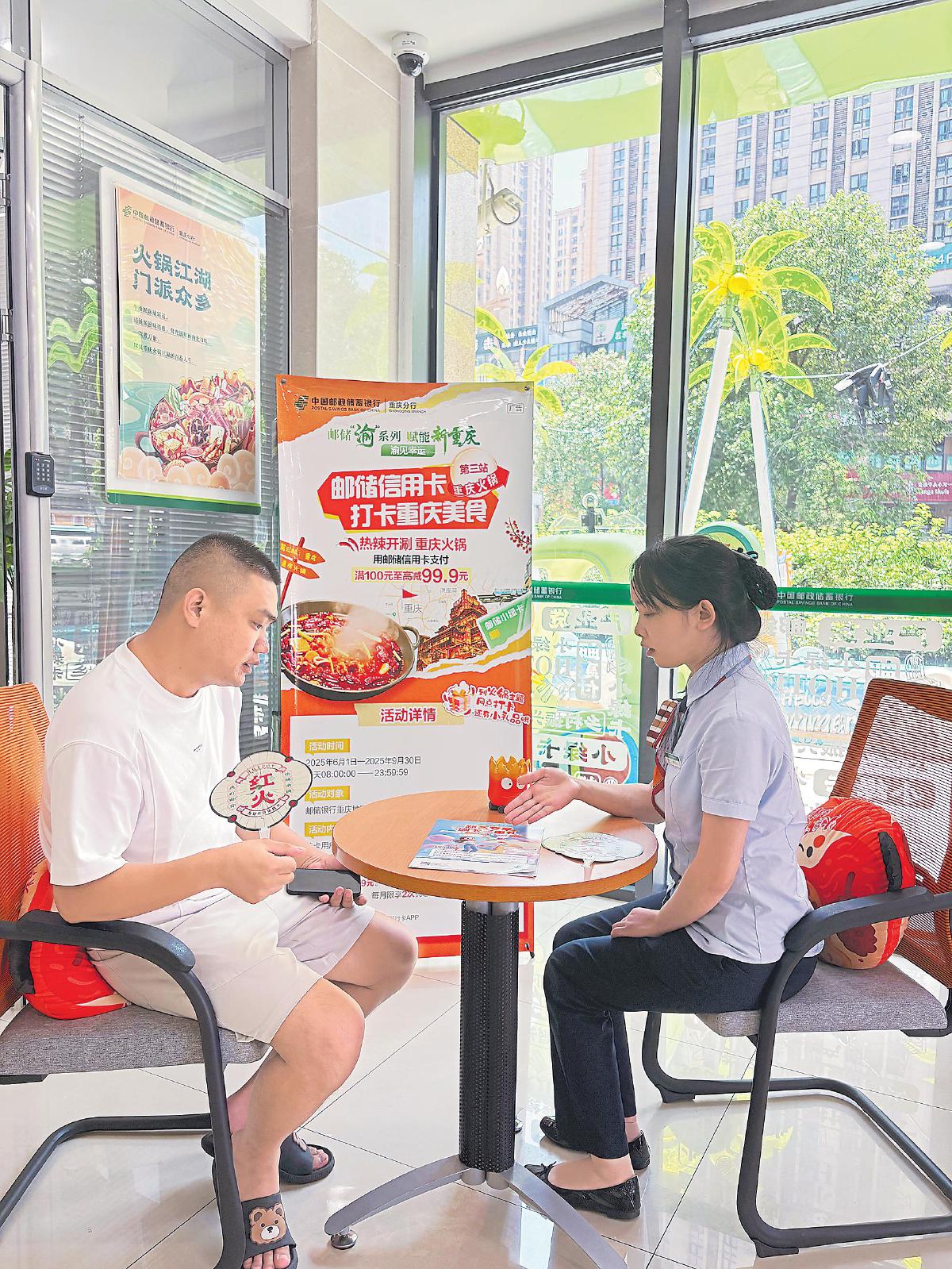立足產(chǎn)業(yè)特色,該支行還推出了“火鍋產(chǎn)業(yè)貸”,以專業(yè)的金融服務(wù)為當(dāng)?shù)靥厣a(chǎn)業(yè)注入強勁動力。同時,該支行積極聯(lián)系網(wǎng)點周邊火鍋商戶,推出了信用卡立減活動?!罢娴氖翘珓澦懔?,我們家附近很多火鍋店都能享受郵儲銀行信用卡的優(yōu)惠。外地的朋友們暑期來重慶旅游,我都要帶他們嘗嘗地道的火鍋。”客戶王女士開心地說道。