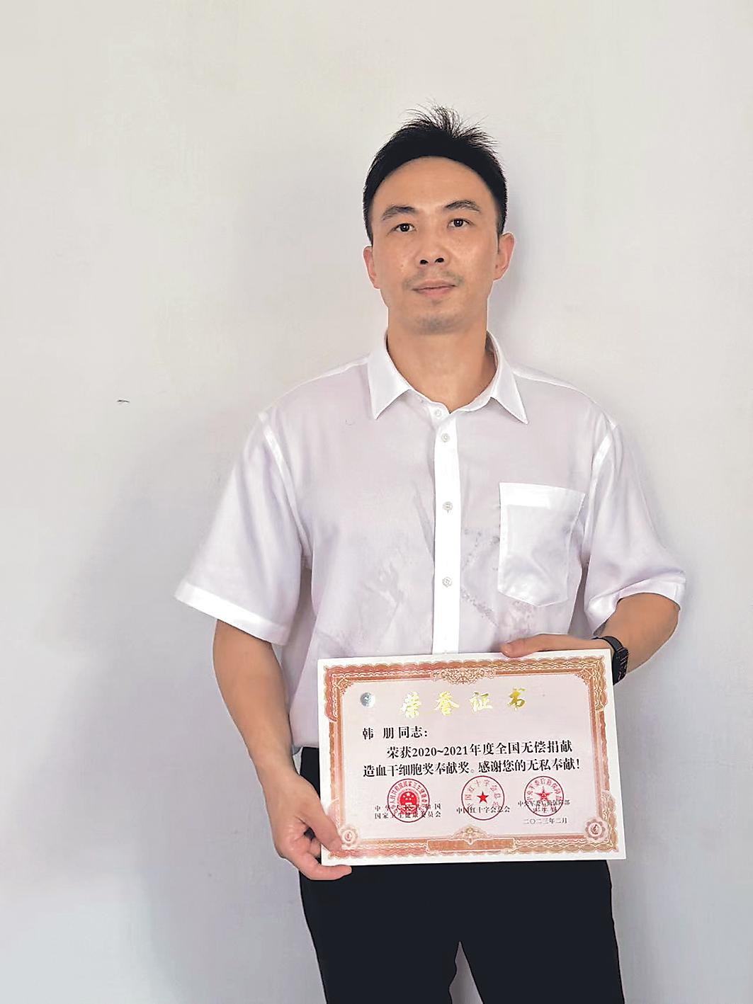 1981年出生的韓朋是同事眼中的“公益先鋒”,多年來堅(jiān)持參與各類志愿服務(wù)。2011年,他在一次公益宣傳活動(dòng)中了解到,造血干細(xì)胞移植對(duì)白血病、再生障礙性貧血等重癥患者有重要意義。懷著對(duì)生命的敬畏和助人的熱忱,他毫不猶豫地報(bào)名成為中華骨髓庫的一員。