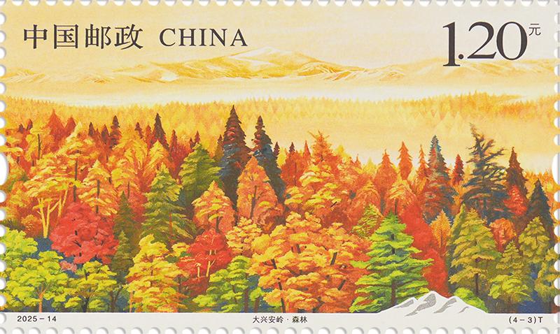 第一枚“濕地”表現(xiàn)了候鳥回歸、杜鵑花開時的濕地風光,展現(xiàn)了大興安嶺良好的生態(tài)環(huán)境。第二枚“火山”表現(xiàn)了火山形成的天池風光,展現(xiàn)了大興安嶺獨特的地理環(huán)境。第三枚“森林”(見上圖)表現(xiàn)了大興安嶺秋天的森林風光,展現(xiàn)了浩瀚原始森林絢麗多彩的景色。第四枚“極光”表現(xiàn)了冬季天空出現(xiàn)絢麗極光的美麗景象,凸顯了高緯度地區(qū)的獨特天象。