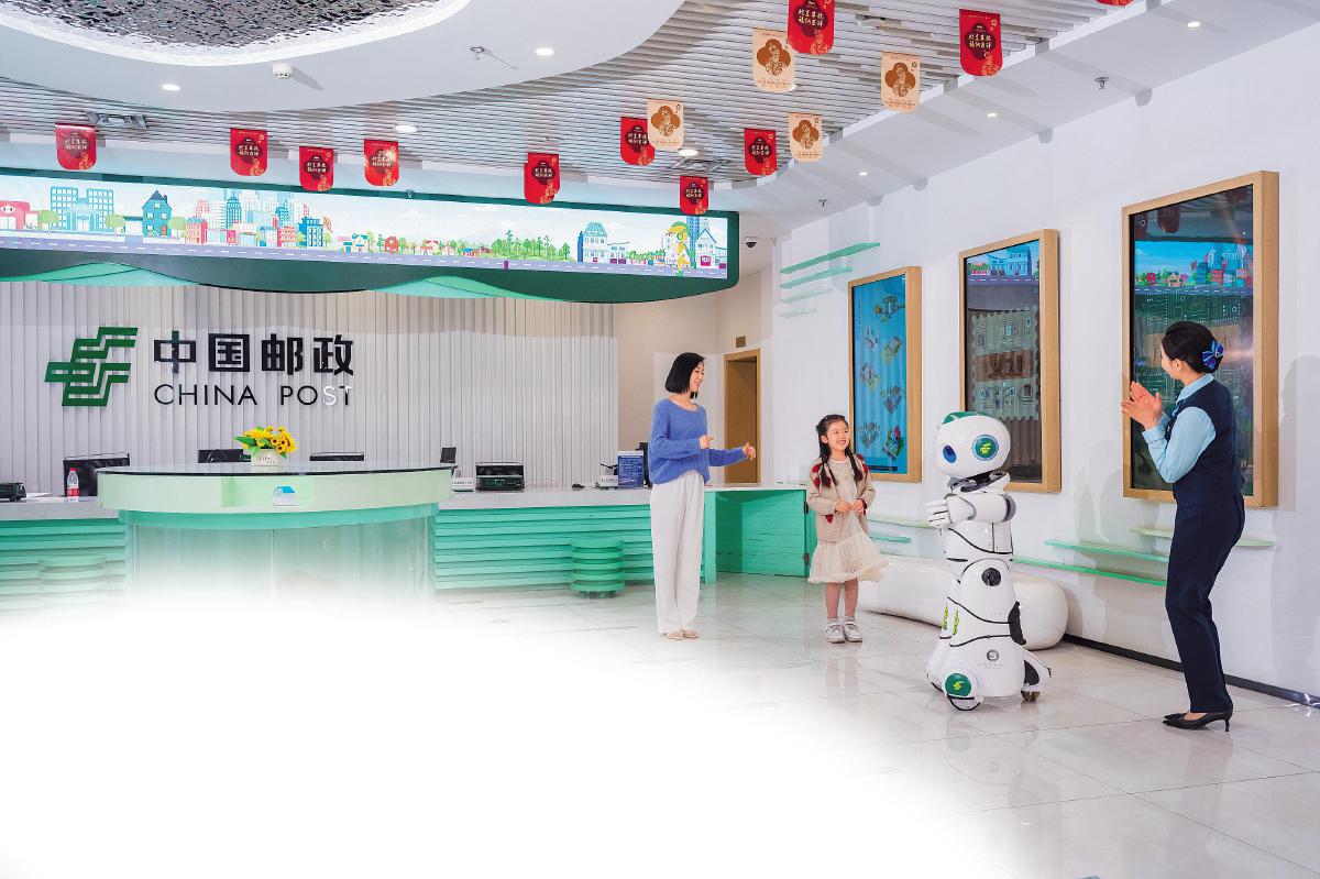 在山東省濟(jì)南市趵突泉郵政支局,圓潤(rùn)可愛的智能機(jī)器人“小郵”正與小朋友共舞。