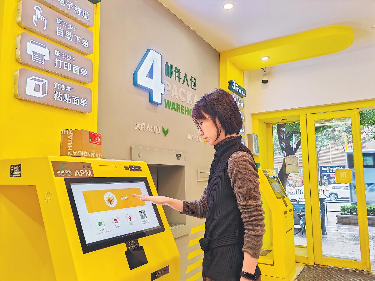 在廣東省深圳市的自助體驗(yàn)式郵局,客戶通過(guò)智能設(shè)備輕松完成包裹寄遞。