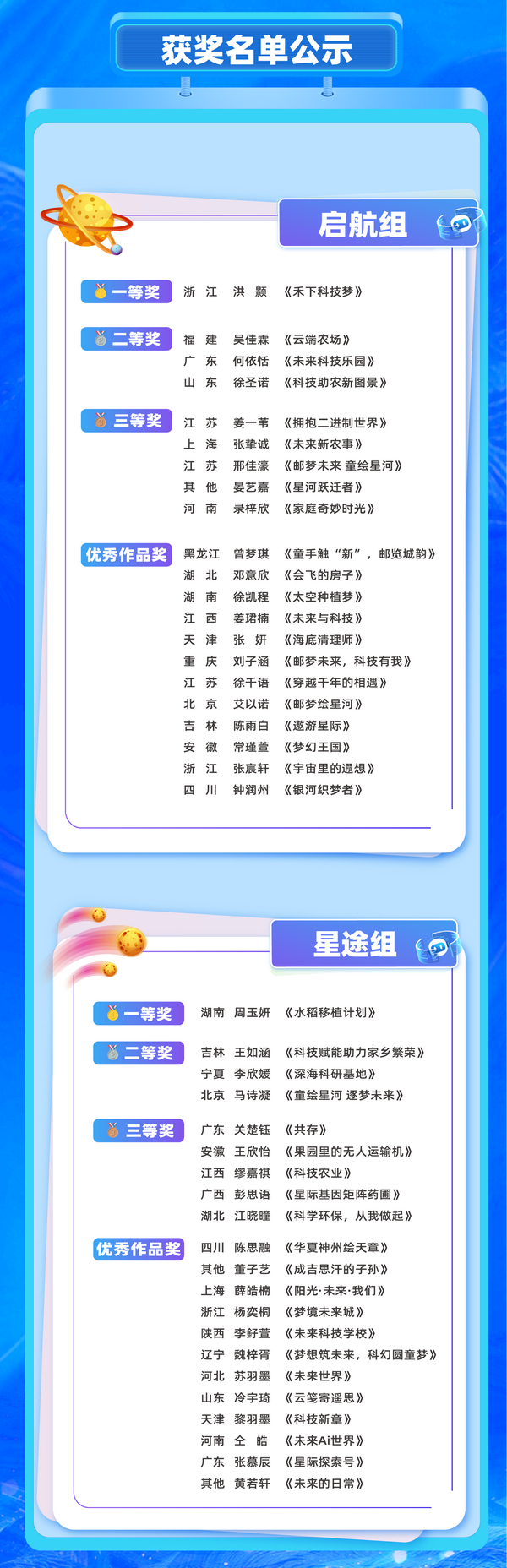 大賽開(kāi)始以來(lái),得到了社會(huì)各界的廣泛關(guān)注與參與,全國(guó)23個(gè)賽區(qū)共收到8.5萬(wàn)幅參賽作品,從中推選出230幅優(yōu)秀作品參與全國(guó)總決賽的評(píng)比。經(jīng)過(guò)激烈的角逐和專(zhuān)家評(píng)委們的嚴(yán)格評(píng)審,評(píng)審出了“一等獎(jiǎng)”2件、“二等獎(jiǎng)”6件、“三等獎(jiǎng)”10件、“優(yōu)秀作品獎(jiǎng)”24件,共計(jì)42件獲獎(jiǎng)作品。來(lái)自全國(guó)各地的參賽小藝術(shù)家們手執(zhí)畫(huà)筆,在方寸郵票上精心描繪未來(lái)科技世界的奇妙圖景,充滿(mǎn)想象力的作品不僅獲得各位評(píng)審專(zhuān)家的高度贊譽(yù),更成為展現(xiàn)新時(shí)代少兒科學(xué)素養(yǎng)與創(chuàng)新活力的亮麗窗口。