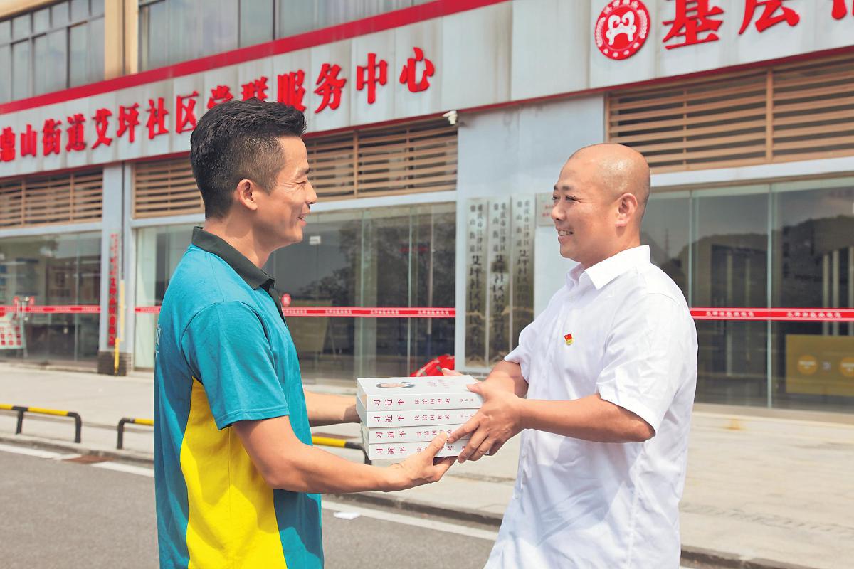 湖北省武漢市郵政分公司充分發(fā)揮點多面廣、直達村組的優(yōu)勢,做好鄉(xiāng)鎮(zhèn)、村組的圖書配送。8月9日上午,當(dāng)江夏區(qū)舒安街道張?zhí)链宕逦瘯ぷ魅藛T接過全國勞模、江夏區(qū)郵政分公司舒安支局投遞員熊桂林送來的《習(xí)近平談治國理政》第五卷后,不禁感慨道:“郵政配送速度真快!”據(jù)了解,僅半天時間,舒安支局就完成了7個建制村、1個街道的圖書配送及預(yù)訂工作,及時保障基層單位的學(xué)習(xí)需求。