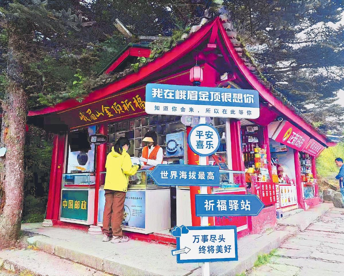 “我給即將離開家上大學(xué)的女兒寄了一枚明信片,希望峨眉的祝福能給她帶來好運(yùn)。”來峨眉山避暑的廣東游客胡先生,在主題郵局挑選了一枚金頂風(fēng)光明信片,認(rèn)真、莊重地寫上地址和祝福之語。在他看來,這枚明信片帶著峨眉山巔的清風(fēng)、云海的靈氣和佛光的加持,沉甸甸的祝福比任何紀(jì)念品都更有意義。