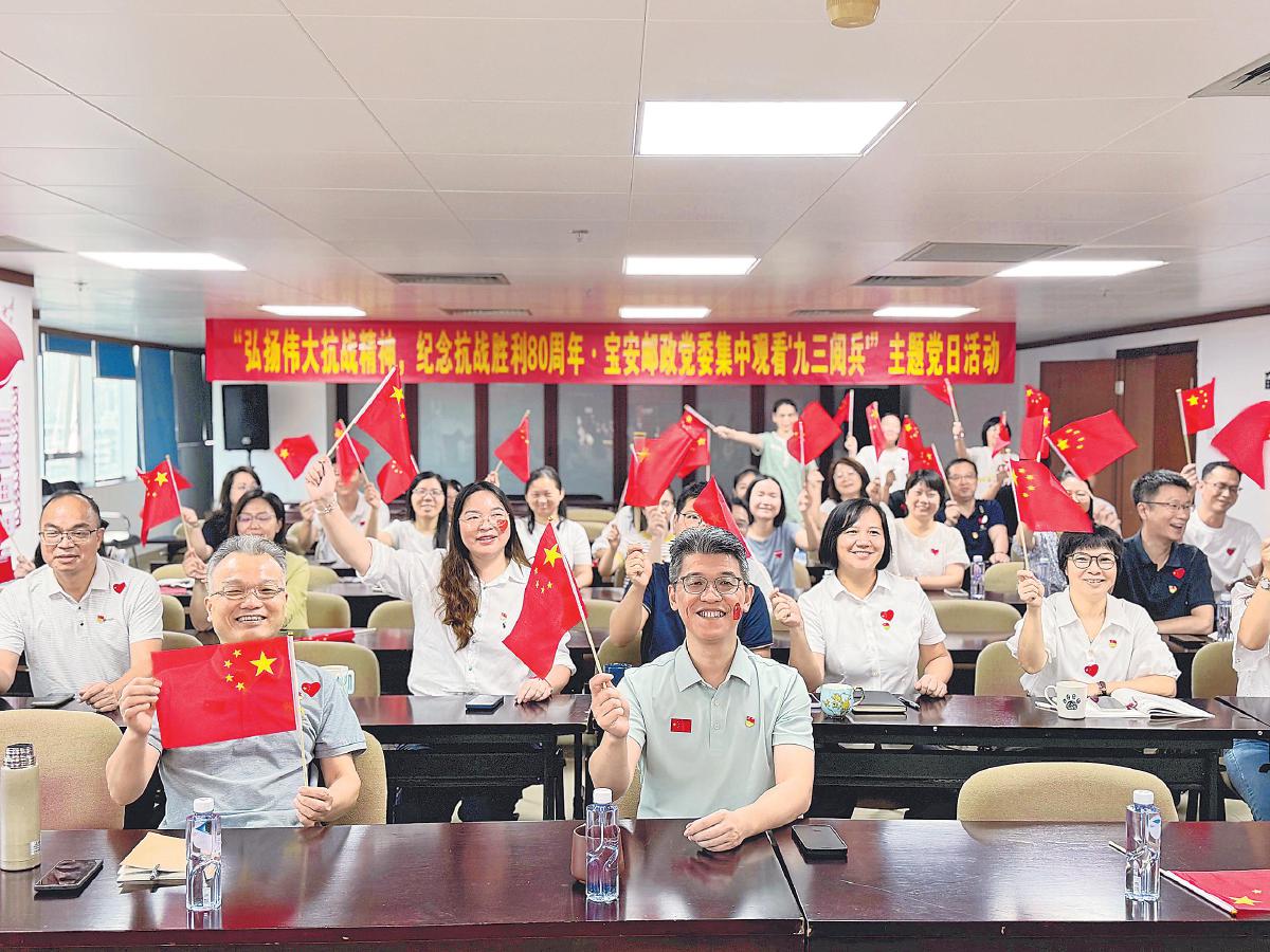 深圳市寶安區(qū)郵政分公司9月3日上午開展主題黨日活動(dòng),組織觀看紀(jì)念大會(huì)直播,引導(dǎo)黨員干部在回望歷史中堅(jiān)定理想信念,在緬懷先烈中凝聚奮進(jìn)力量?! 鮿㈧o娜 攝