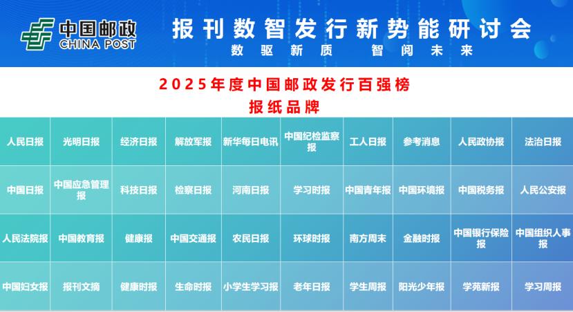 會(huì)上,集團(tuán)公司報(bào)刊發(fā)行局發(fā)布了備受關(guān)注的“2025年度中國(guó)郵政發(fā)行百?gòu)?qiáng)榜”,包括《人民日?qǐng)?bào)》、《光明日?qǐng)?bào)》在內(nèi)的40家報(bào)紙品牌,《求是》、《中國(guó)紀(jì)檢監(jiān)察》等50家期刊品牌,以及參考消息數(shù)字報(bào)、人民日?qǐng)?bào)健康客戶(hù)端等10家數(shù)媒品牌上榜。此次百?gòu)?qiáng)評(píng)定綜合考慮了郵發(fā)報(bào)刊的發(fā)行量、品牌影響力、媒體融合發(fā)展的貢獻(xiàn)度等多個(gè)指標(biāo)。此外,報(bào)刊發(fā)行局在此次會(huì)上還與河南日?qǐng)?bào)報(bào)業(yè)集團(tuán)、《人民論壇》雜志社、中國(guó)交通報(bào)社、中國(guó)農(nóng)業(yè)出版社、中航出版?zhèn)髅接邢挢?zé)任公司以及《財(cái)經(jīng)》雜志等多家單位簽訂戰(zhàn)略合作協(xié)議,標(biāo)志著中國(guó)郵政在報(bào)刊數(shù)智發(fā)行領(lǐng)域合作網(wǎng)絡(luò)的進(jìn)一步拓展。