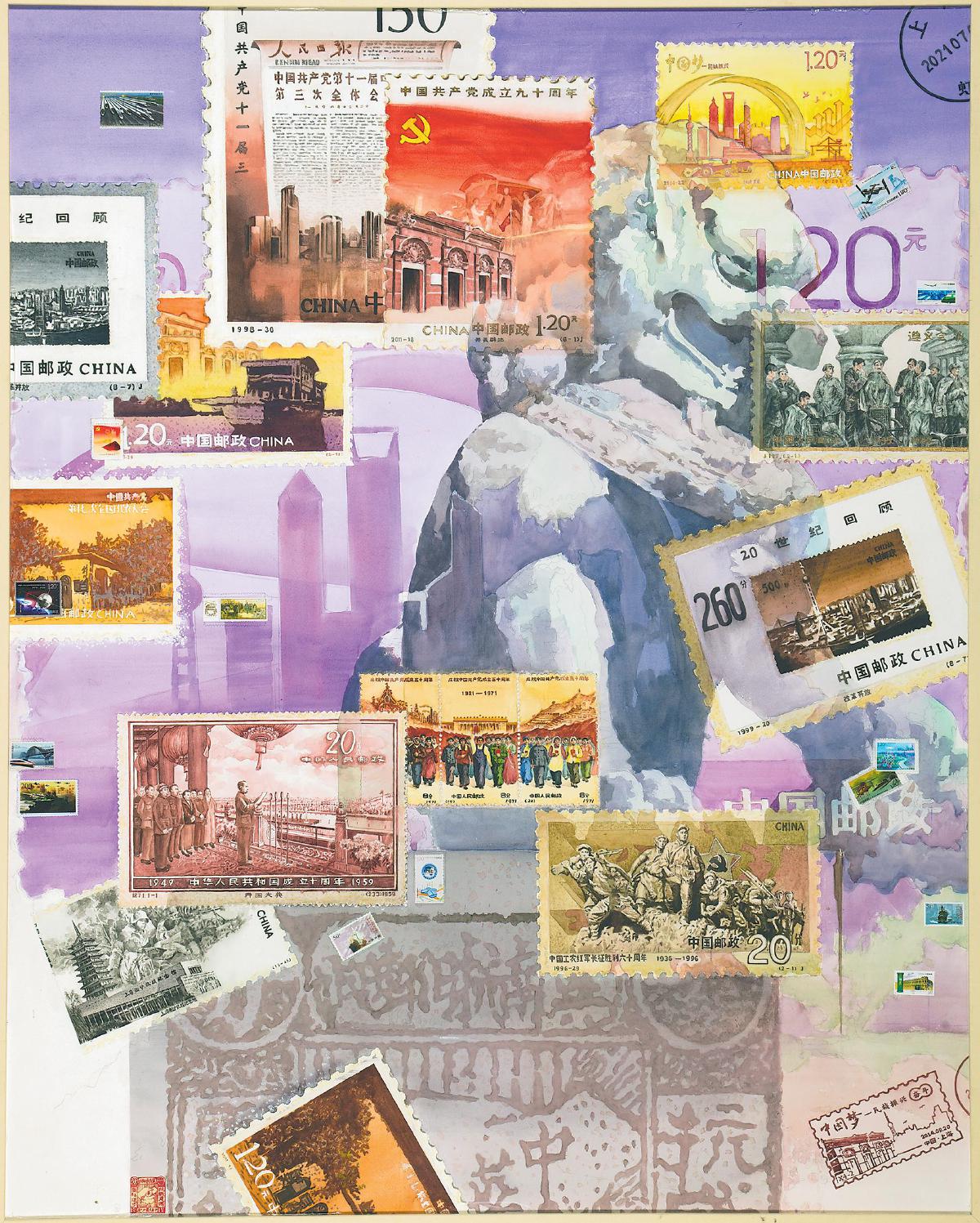 為了更好地完成畫作,田燕萍還請教了她的繪畫老師——浙江省美術(shù)家協(xié)會(huì)會(huì)員、水彩畫界策展人馬百齊?!胺酱鐚Ξ嬀?,頗有歷史和藝術(shù)的價(jià)值?!瘪R百齊肯定了田燕萍的創(chuàng)作思路,并在郵票選取、表現(xiàn)手法、繪畫技巧上對其進(jìn)行了專業(yè)的指導(dǎo)。