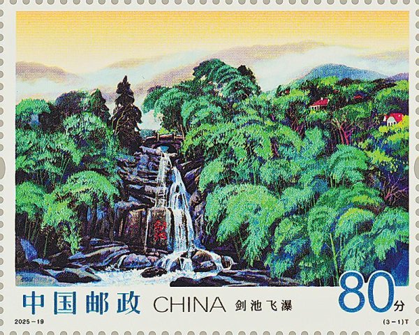第一枚“劍池飛瀑”(見(jiàn)圖),敘述了莫干山的古老傳說(shuō)。郵票畫面聚焦劍池瀑布自蒼崖飛瀉而下的剎那,與周邊環(huán)繞的茂林翠柏、蒼巖石壁共同講述干將、莫邪鑄劍的傳奇故事。第二枚“群墅點(diǎn)翠”,呈現(xiàn)了莫干山的建筑風(fēng)貌。此枚郵票將掩映在翠竹間眾多風(fēng)格各異的別墅盡收眼底,別墅群落依山就勢(shì),錯(cuò)落層疊,紅瓦青磚與修竹勁松相映成趣。第三枚“旭光云?!?,描繪了莫干山的日出景象。該枚郵票定格了莫干山旭日東升的壯麗景象,旭光臺(tái)作為莫干山觀賞日出的絕佳觀景臺(tái),將天地交輝的盛景盡收眼底。